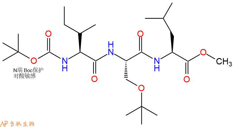 | 三字母: | H2N N端氨基:N-terminal amino group。在肽或多肽链中含有游离a-氨基的氨基酸一端。在表示氨基酸序列时,通常将N端放在肽链的左边。 -IleL-异亮氨酸:isoleucine。系统命名为(2S)-氨基-(3R)-甲基戊酸。是编码氨基酸。有两个手性碳原子,是哺乳动物的必需氨基酸。符号:I,Ile。 -SerL-丝氨酸:serine。系统命名为(2S)-氨基-3-羟基丙酸。是编码氨基酸。因可从蚕丝中获得而得名。符号:S,Ser。在丝原蛋白及某些抗菌素中含有 D-丝氨酸。 -LeuL-亮氨酸:leucine。系统命名为(2S)-氨基-4-甲基戊酸。是编码氨基酸。是哺乳动物的必需氨基酸。符号:L,Leu。 -OMeC端甲酯化修饰,甲酯是最简单的酯类,在溶液合成中作为重要的半永久性C端保护基团。它们可以转化为肽肼,而肽肼是反应性肽叠氮化物的先驱体。叠氮偶联仍是肽溶液合成中片段偶联最常用的方法。 |