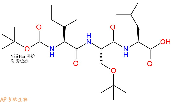6、全保护切割:配置0.5%TFA/DCM溶液,溶液体积约为树脂体积的3倍。再次用DCM洗涤树脂2遍(去除残留DMF),后将配置好的溶液倒入到反应器中,反应30分钟。抽滤树脂,收集滤液(此时多肽已经从树脂上分离,存在于滤液中)。多肽序列为 Boc-Ile-Ser(tBu)-Leu-CTC Resin。 在滤液中添加DIEPA,调PH至7-8。用饱和NaHCO3洗涤滤液,分离出DCM层溶液。可适当旋蒸DCM层溶液,减少有机溶剂。再次加入1或2倍体积的乙酸乙酯,用稀HCl溶液调PH至微酸性,将多肽从DCM层萃取到乙酸乙酯层。用饱和NaCl洗涤2次乙酸乙酯层。用无水硫酸镁吸收乙酸乙酯层的水分。通过减压旋蒸,直接将乙酸乙酯完全旋蒸掉,得到晶体状固体多肽,用于下一步C端反应。或通过减压旋蒸保留适量乙酸乙酯的溶液体积,加入冰乙醚析出 多肽,然后对多肽进行烘干操作即可用于下一步C端反应。Boc-Ile-Ser(tBu)-Leu-COOH的结构图如下。