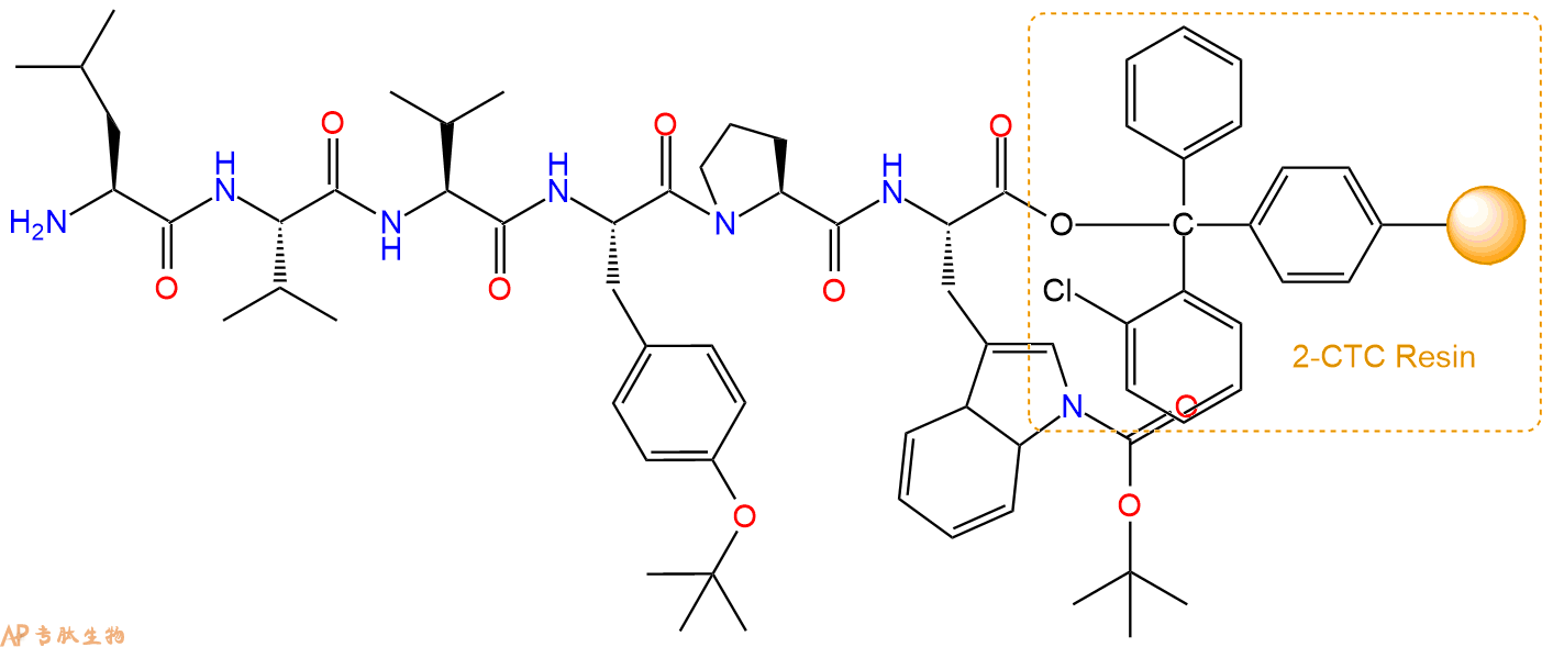 最后再经过步骤二得到 H2N-Leu-Val-Val-Tyr(tBu)-Pro-Trp(Boc)-CTC Resin,结构如下: