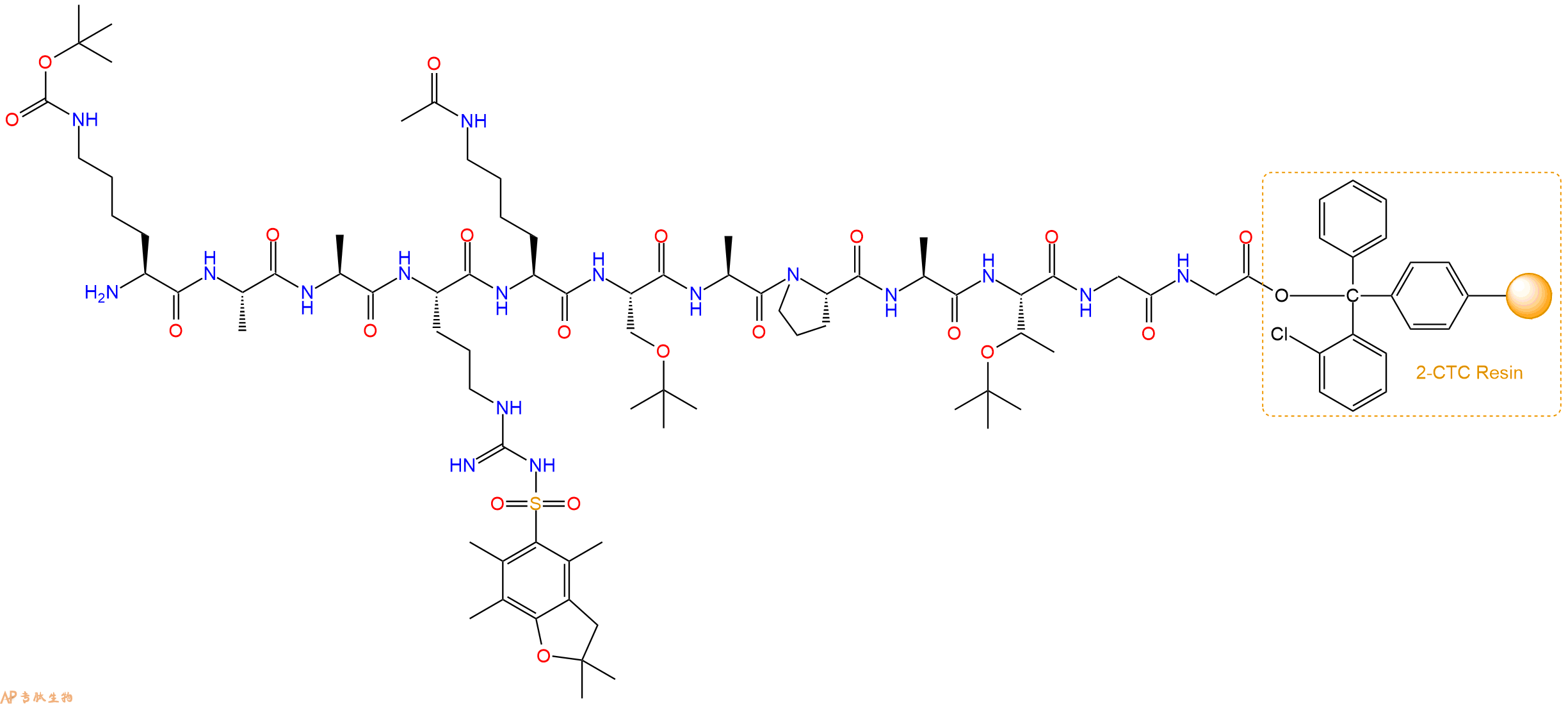 最后再经过步骤二得到 H2N-Lys(Boc)-Ala-Ala-Arg(Pbf)-Lys(Ac)-Ser(tBu)-Ala-Pro-Ala-Thr(tBu)-Gly-Gly-CTC Resin,结构如下: