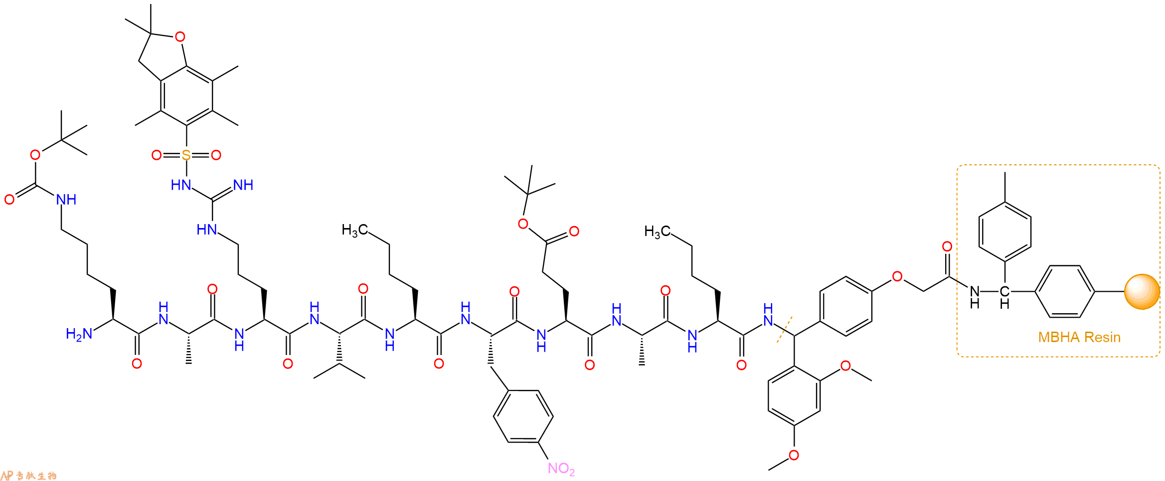 最后再经过步骤二得到 H2N-Lys(Boc)-Ala-Arg(Pbf)-Val-Nle-Phe(4NO2)-Glu(OtBu)-Ala-Nle-Linker-MBHA Resin,结构如下: