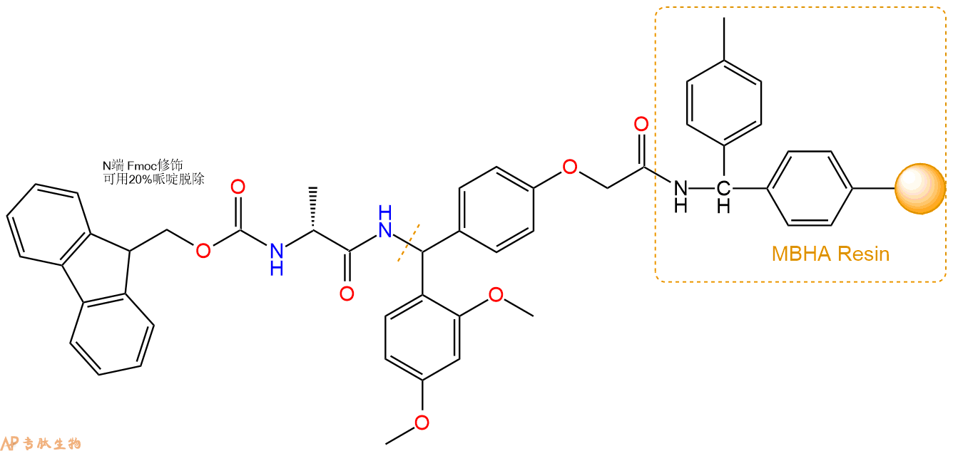 1、合成MBHA树脂:取若干克的MBHA树脂(如初始取代度为0.5mmol/g)和1倍树脂摩尔量的Fmoc-Linker-OH加入到反应器中,加入DMF,搅拌使氨基酸完全溶解。再加入树脂2倍量的DIEPA,搅拌混合均匀。再加入树脂0.95倍量的HBTU,搅拌混合均匀。反应3-4小时后,用DMF洗涤3次。用2倍树脂体积的10%乙酸酐/DMF 进行封端30分钟。然后再用DMF洗涤3次,甲醇洗涤2次,DCM洗涤2次,再用甲醇洗涤2次。真空干燥12小时以上,得到干燥的树脂{Fmoc-Linker-MHBA Resin},测定取代度。这里测得取代度为 0.3mmol/g。结构如下图: