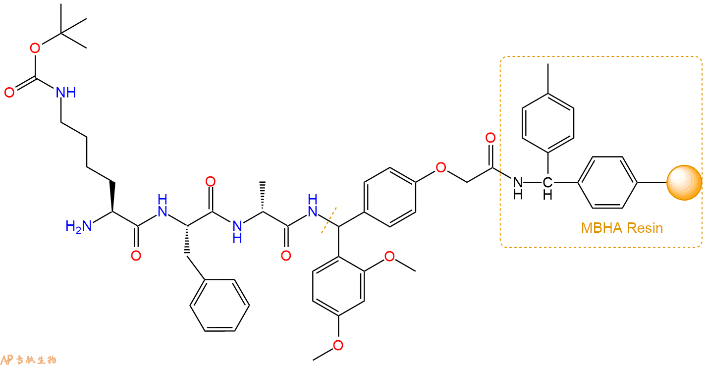最后再经过步骤二得到 H2N-Lys(Boc)-Phe-DAla-Linker-MBHA Resin,结构如下: