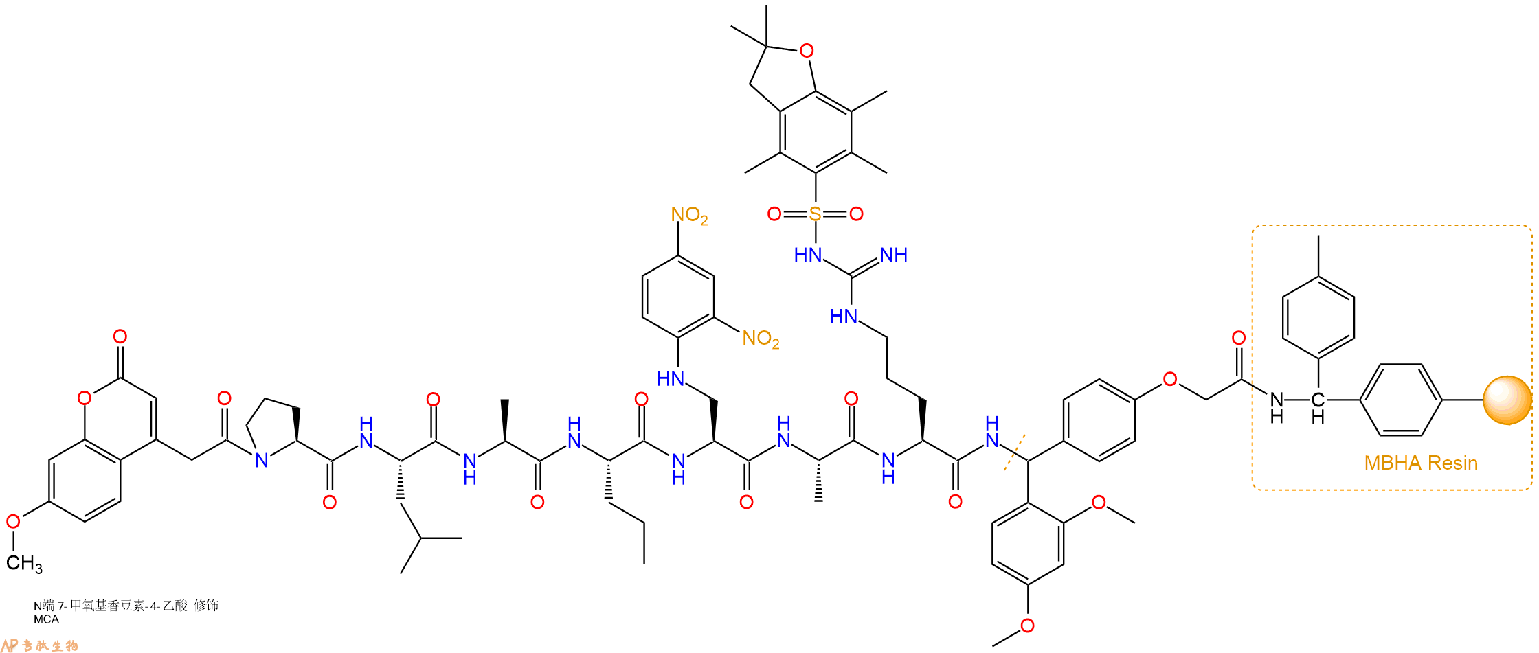 5、7-甲氧基香豆素-4-乙酸(MCA)反应连接:在上述树脂中,加入适当DMF后,再加入1.88mmol 7-甲氧基香豆素-4-乙酸(MCA)到树脂中,再加入3.76mmol DIPEA、1.79mmol HBTU,鼓氮气反应30分钟。用2倍树脂体积的DMF 洗涤3次树脂(洗涤树脂,去掉残留溶剂,为下一步反应做准备)。 得到MCA-Pro-Leu-Ala-Nva-Dap(Dnp)-Ala-Arg(Pbf)-Linker-MBHAResin。 结构如下: