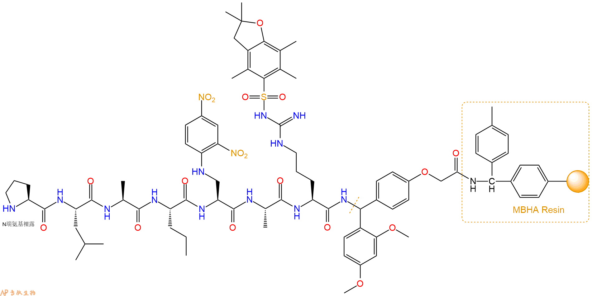 最后再经过步骤二得到 H2N-Pro-Leu-Ala-Nva-Dap(Dnp)-Ala-Arg(Pbf)-Linker-MBHA Resin,结构如下: