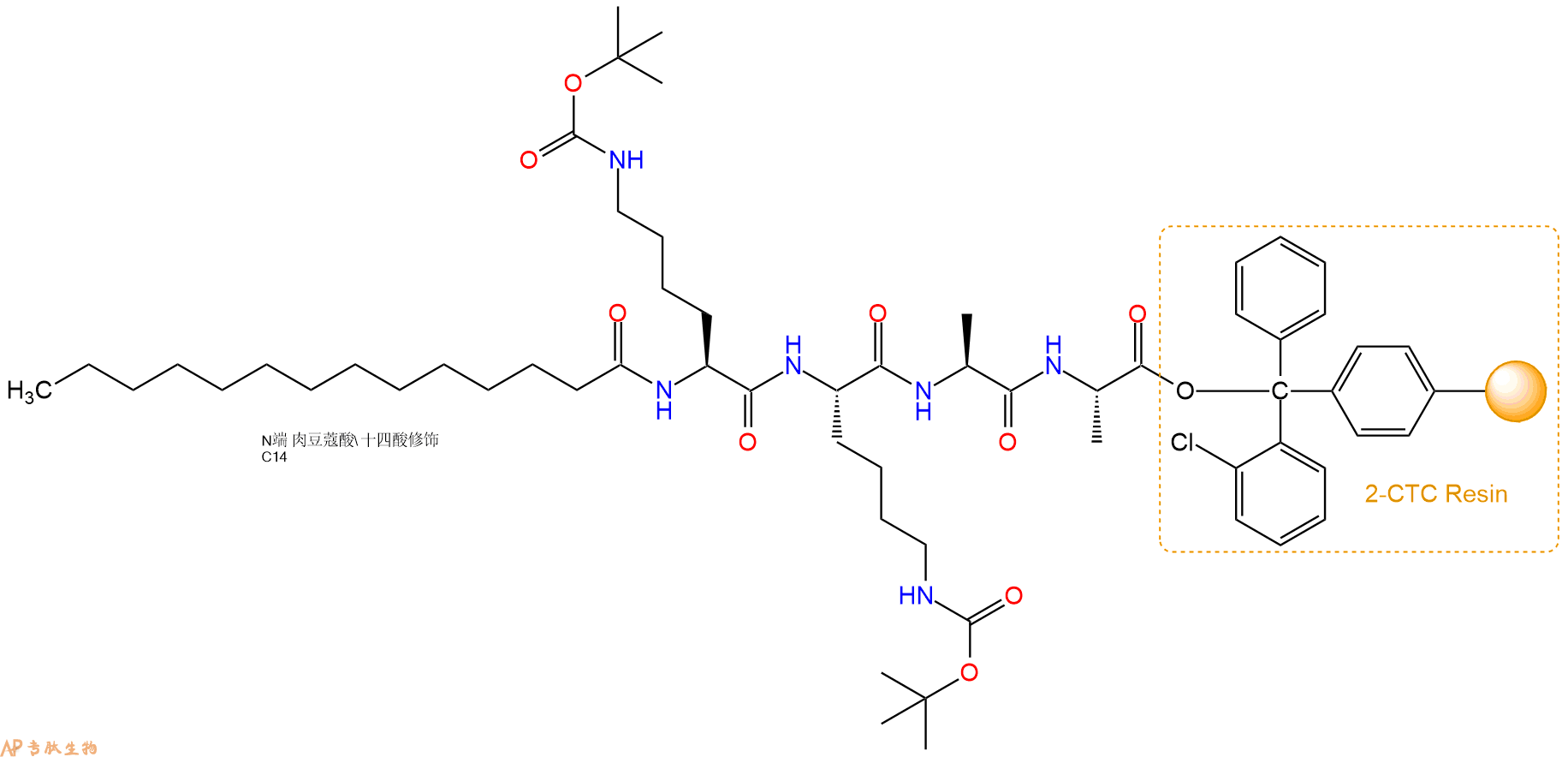 5、肉豆蔻酸反应连接:在上述树脂中,加入适当DMF后,再加入7.36mmol 肉豆蔻酸到树脂中,再加入14.72mmol DIPEA、6.99mmol HBTU,鼓氮气反应30分钟。用2倍树脂体积的DMF 洗涤3次树脂(洗涤树脂,去掉残留溶剂,为下一步反应做准备)。 得到Myristicacid-Lys(Boc)-Lys(Boc)-Ala-Ala-CTCResin。 结构如下: