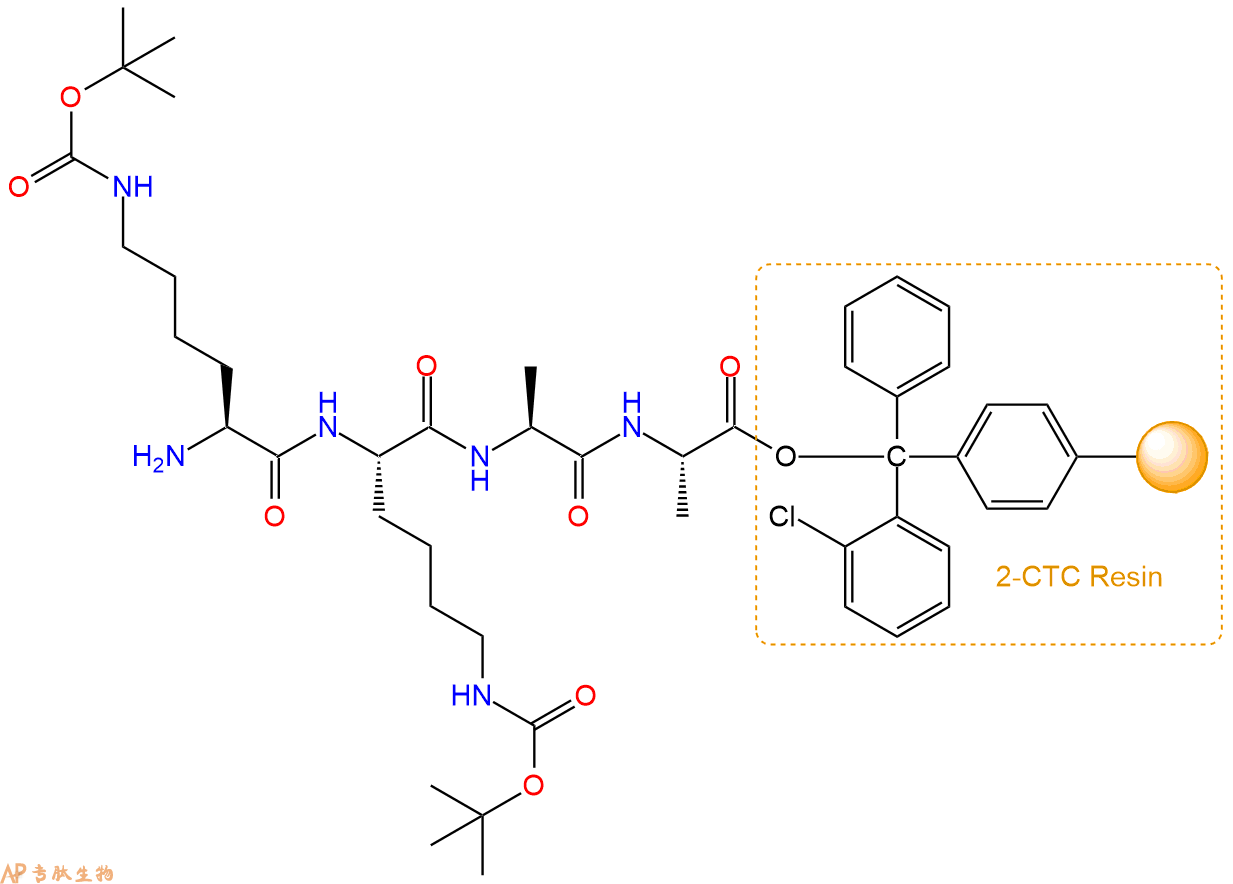 最后再经过步骤二得到 H2N-Lys(Boc)-Lys(Boc)-Ala-Ala-CTC Resin,结构如下: