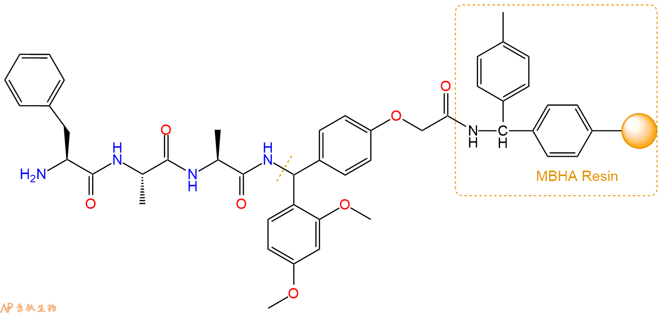 最后再经过步骤二得到 H2N-Phe-Ala-Ala-Linker-MBHA Resin,结构如下: