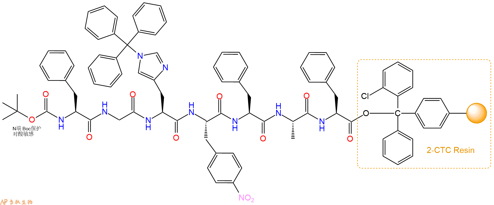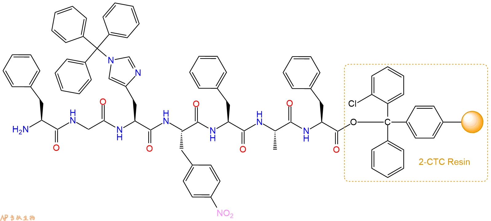 最后再经过步骤二得到 H2N-Phe-Gly-His(Trt)-Phe(4NO2)-Phe-Ala-Phe-CTC Resin,结构如下: