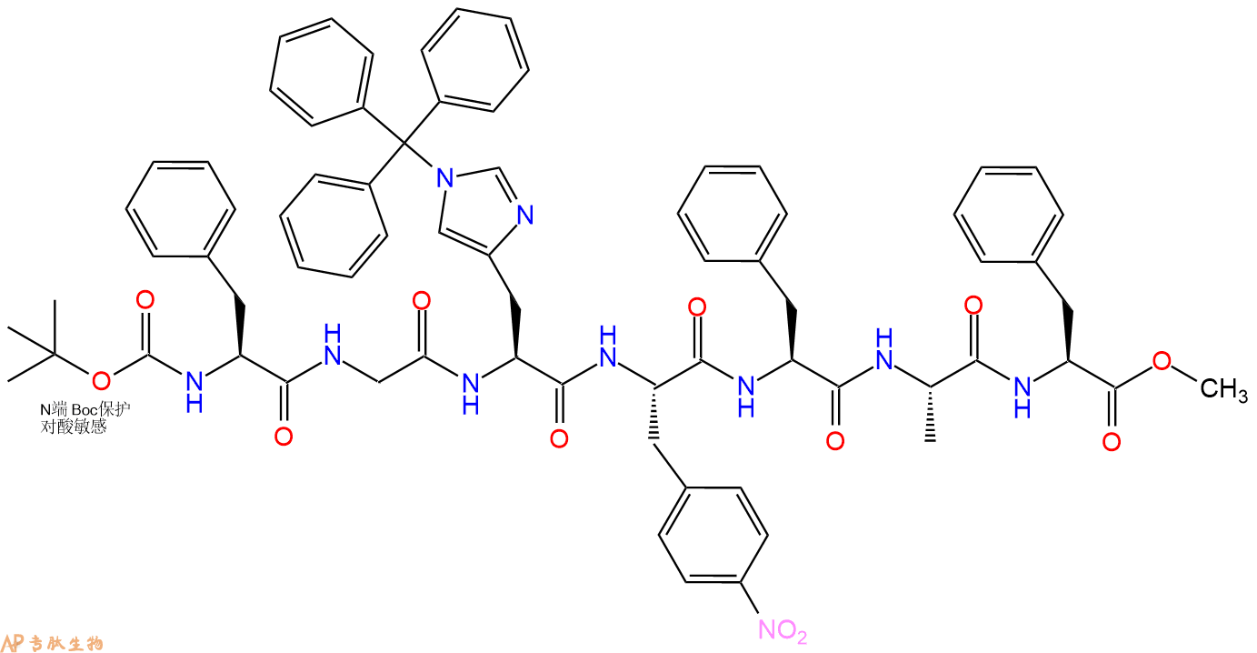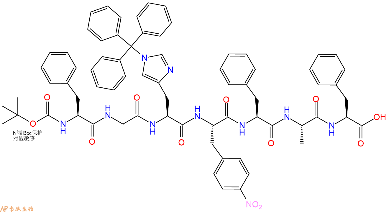 6、全保护切割:配置0.5%TFA/DCM溶液,溶液体积约为树脂体积的3倍。再次用DCM洗涤树脂2遍(去除残留DMF),后将配置好的溶液倒入到反应器中,反应30分钟。抽滤树脂,收集滤液(此时多肽已经从树脂上分离,存在于滤液中)。多肽序列为 Boc-Phe-Gly-His(Trt)-Phe(4NO2)-Phe-Ala-Phe-CTC Resin。 在滤液中添加DIEPA,调PH至7-8。用饱和NaHCO3洗涤滤液,分离出DCM层溶液。可适当旋蒸DCM层溶液,减少有机溶剂。再次加入1或2倍体积的乙酸乙酯,用稀HCl溶液调PH至微酸性,将多肽从DCM层萃取到乙酸乙酯层。用饱和NaCl洗涤2次乙酸乙酯层。用无水硫酸镁吸收乙酸乙酯层的水分。通过减压旋蒸,直接将乙酸乙酯完全旋蒸掉,得到晶体状固体多肽,用于下一步C端反应。或通过减压旋蒸保留适量乙酸乙酯的溶液体积,加入冰乙醚析出 多肽,然后对多肽进行烘干操作即可用于下一步C端反应。Boc-Phe-Gly-His(Trt)-Phe(4NO2)-Phe-Ala-Phe-COOH的结构图如下。