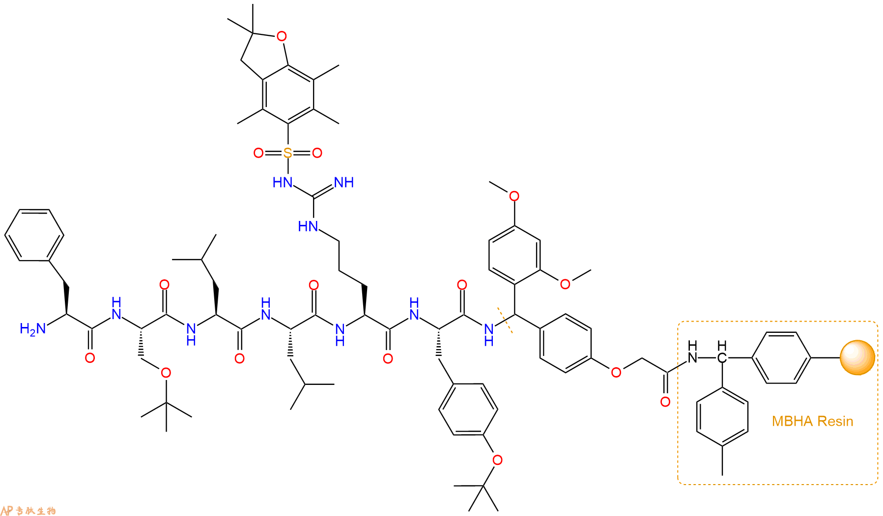 最后再经过步骤二得到 H2N-Phe-Ser(tBu)-Leu-Leu-Arg(Pbf)-Tyr(tBu)-Linker-MBHA Resin,结构如下: