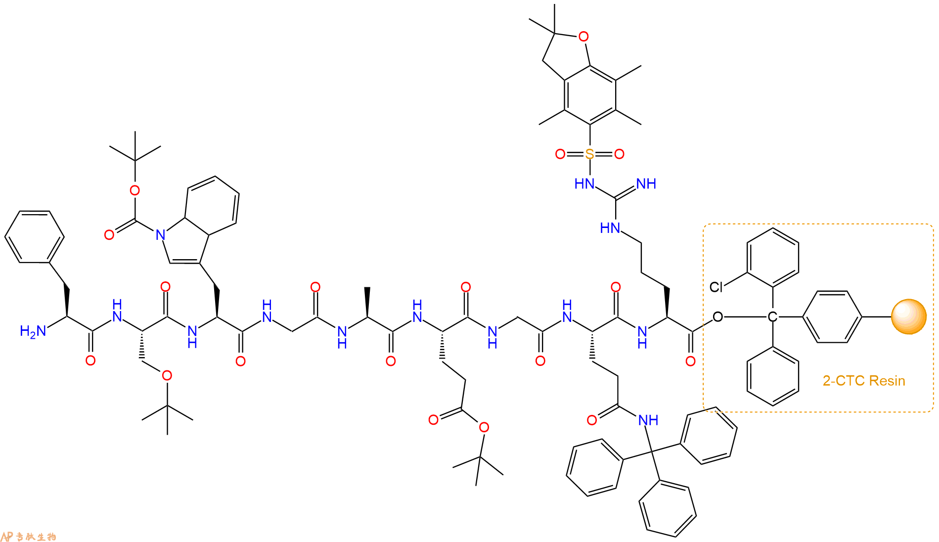 最后再经过步骤二得到 H2N-Phe-Ser(tBu)-Trp(Boc)-Gly-Ala-Glu(OtBu)-Gly-Gln(Trt)-Arg(Pbf)-CTC Resin,结构如下: