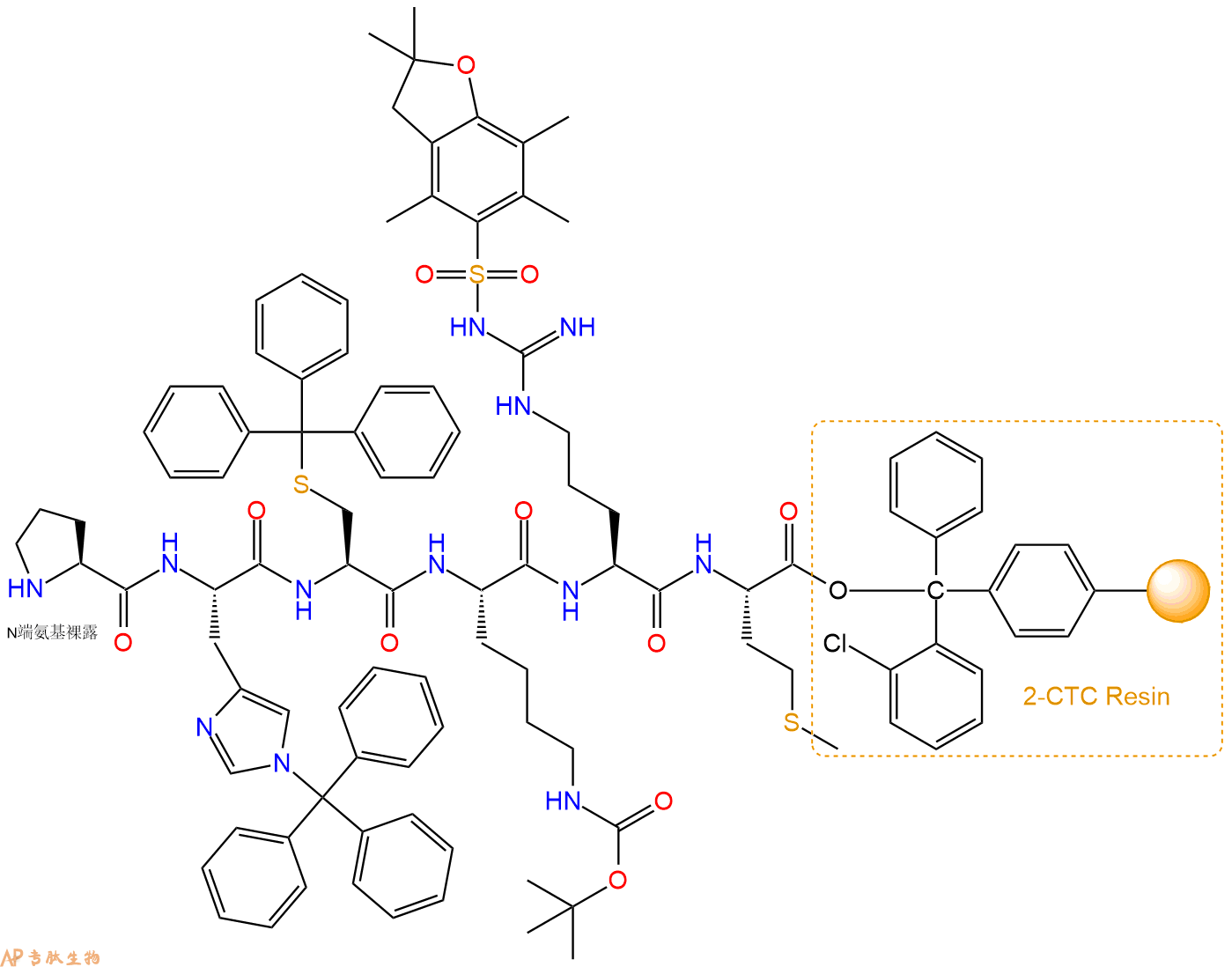 最后再经过步骤二得到 H2N-Pro-His(Trt)-Cys(Trt)-Lys(Boc)-Arg(Pbf)-Met-CTC Resin,结构如下: