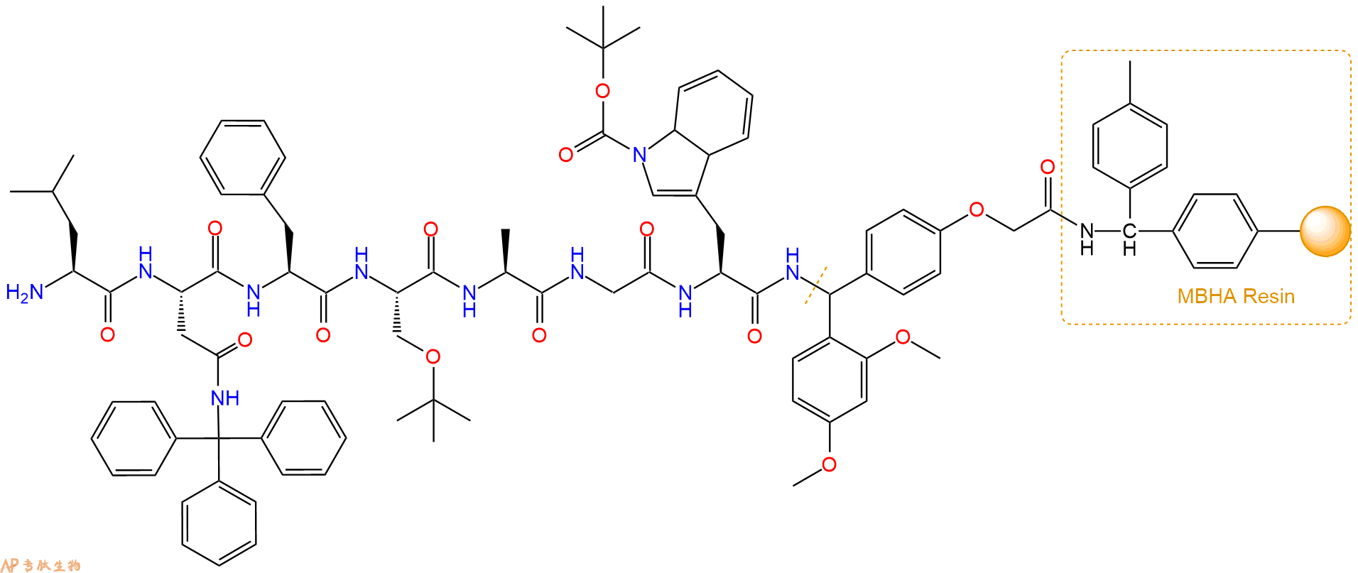 最后再经过步骤二得到 H2N-Leu-Asn(Trt)-Phe-Ser(tBu)-Ala-Gly-Trp(Boc)-Linker-MBHA Resin,结构如下: