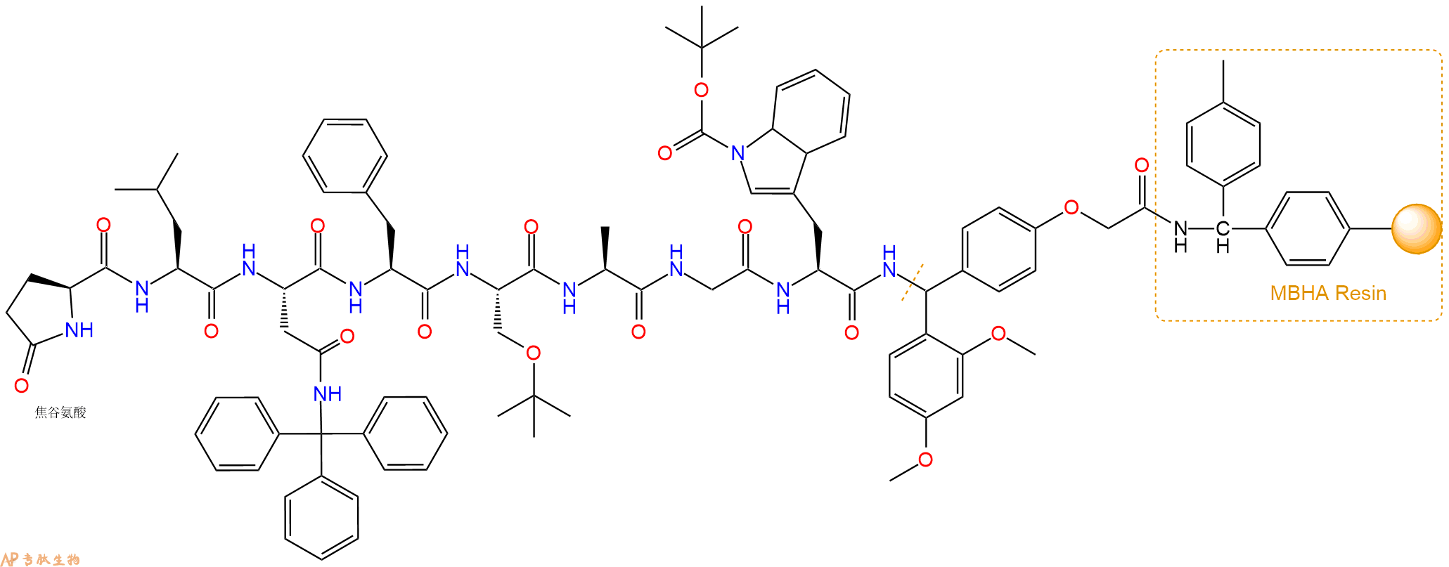 5、焦谷氨酸反应连接:在上述树脂中,加入适当DMF后,再加入1.4mmol 焦谷氨酸到树脂中,再加入2.79mmol DIPEA、1.33mmol HBTU,鼓氮气反应30分钟。用2倍树脂体积的DMF 洗涤3次树脂(洗涤树脂,去掉残留溶剂,为下一步反应做准备)。 得到Pyr-Leu-Asn(Trt)-Phe-Ser(tBu)-Ala-Gly-Trp(Boc)-Linker-MBHAResin。 结构如下: