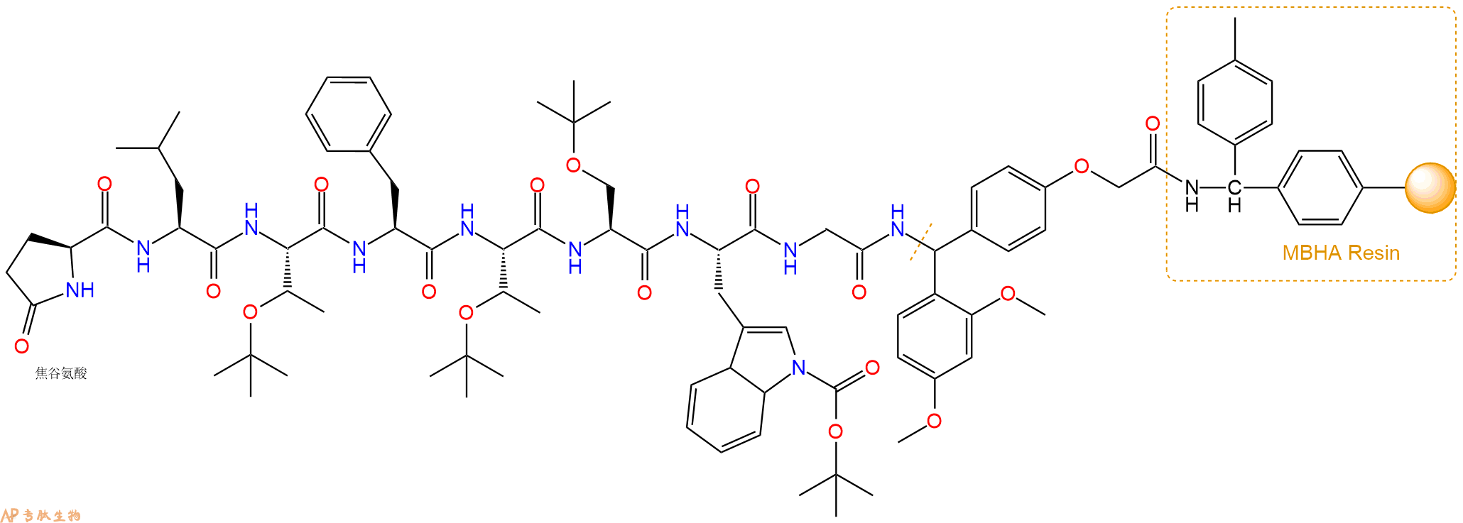 最后再经过步骤二得到 H2N-Leu-Thr(tBu)-Phe-Thr(tBu)-Ser(tBu)-Trp(Boc)-Gly-Linker-MBHA Resin,结构如下: