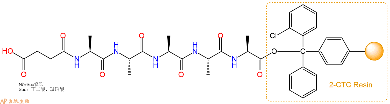 5、丁二酸反应连接:在上述树脂中,加入适当DMF后,再加入8.94mmol丁二酸到树脂中,再加入17.87mmol DIPEA,鼓氮气反应30分钟。用2倍树脂体积的DMF 洗涤3次树脂(洗涤树脂,去掉残留溶剂,为下一步反应做准备)。 得到Suc-Ala-Ala-Ala-Ala-Ala-CTC Resin。 结构如下:
