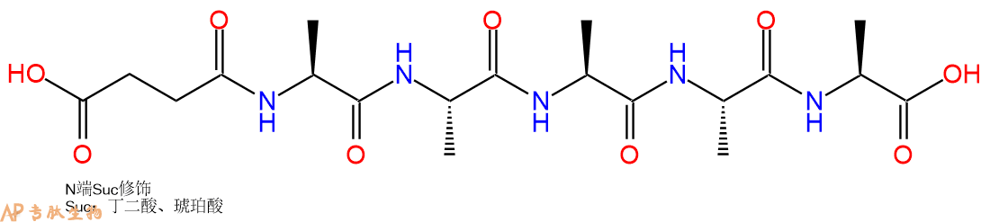 6、全保护切割:配置0.5%TFA/DCM溶液,溶液体积约为树脂体积的3倍。再次用DCM洗涤树脂2遍(去除残留DMF),后将配置好的溶液倒入到反应器中,反应30分钟。抽滤树脂,收集滤液(此时多肽已经从树脂上分离,存在于滤液中)。多肽序列为 Suc-Ala-Ala-Ala-Ala-Ala-CTC Resin。 在滤液中添加DIEPA,调PH至7-8。用饱和NaHCO3洗涤滤液,分离出DCM层溶液。可适当旋蒸DCM层溶液,减少有机溶剂。再次加入1或2倍体积的乙酸乙酯,用稀HCl溶液调PH至微酸性,将多肽从DCM层萃取到乙酸乙酯层。用饱和NaCl洗涤2次乙酸乙酯层。用无水硫酸镁吸收乙酸乙酯层的水分。通过减压旋蒸,直接将乙酸乙酯完全旋蒸掉,得到晶体状固体多肽,用于下一步C端反应。或通过减压旋蒸保留适量乙酸乙酯的溶液体积,加入冰乙醚析出 多肽,然后对多肽进行烘干操作即可用于下一步C端反应。Suc-Ala-Ala-Ala-Ala-Ala-COOH的结构图如下。