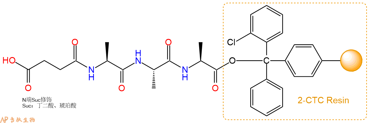 5、丁二酸反应连接:在上述树脂中,加入适当DMF后,再加入2.67mmol丁二酸到树脂中,再加入5.35mmol DIPEA,鼓氮气反应30分钟。用2倍树脂体积的DMF 洗涤3次树脂(洗涤树脂,去掉残留溶剂,为下一步反应做准备)。 得到Suc-Ala-Ala-Ala-CTC Resin。 结构如下:
