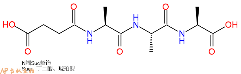 | 三字母: | Suc N端琥珀酰化,琥珀酰基是一种极性的N端修饰,对应于脱氨基天冬氨酸(deamino-Asp),常被掺入羧肽酶底物中。 -Ala丙氨酸:alanine。L-丙氨酸的系统命名为(2S)-氨基丙酸,是编码氨基酸,也叫L-α-丙氨酸。符号:A,Ala。D-丙氨酸存在于多种细菌细胞壁的糖肽中。β-丙氨酸是维生素泛酸和辅酶A的组分。 -Ala丙氨酸:alanine。L-丙氨酸的系统命名为(2S)-氨基丙酸,是编码氨基酸,也叫L-α-丙氨酸。符号:A,Ala。D-丙氨酸存在于多种细菌细胞壁的糖肽中。β-丙氨酸是维生素泛酸和辅酶A的组分。 -Ala丙氨酸:alanine。L-丙氨酸的系统命名为(2S)-氨基丙酸,是编码氨基酸,也叫L-α-丙氨酸。符号:A,Ala。D-丙氨酸存在于多种细菌细胞壁的糖肽中。β-丙氨酸是维生素泛酸和辅酶A的组分。 -AMC7-氨基-4-甲基香豆素(AMC或Amc)是一种荧光染料,其激发波长为350纳米,发射波长为450纳米。 |