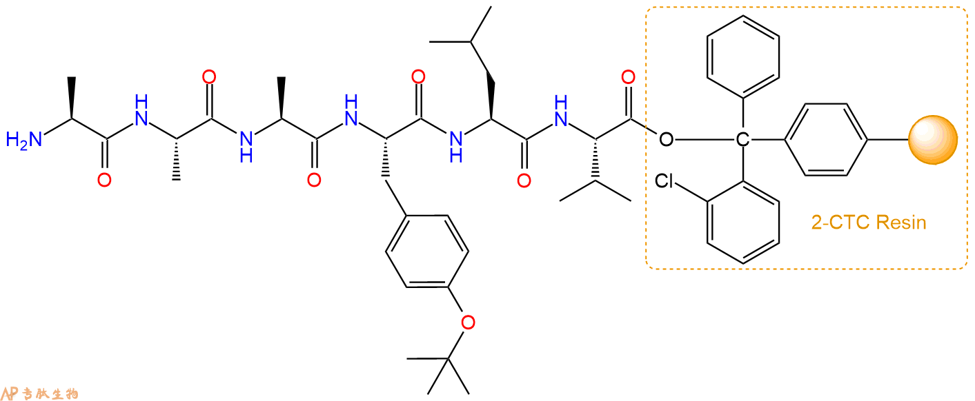 最后再经过步骤二得到 H2N-Ala-Ala-Ala-Tyr(tBu)-Leu-Val-CTC Resin,结构如下: