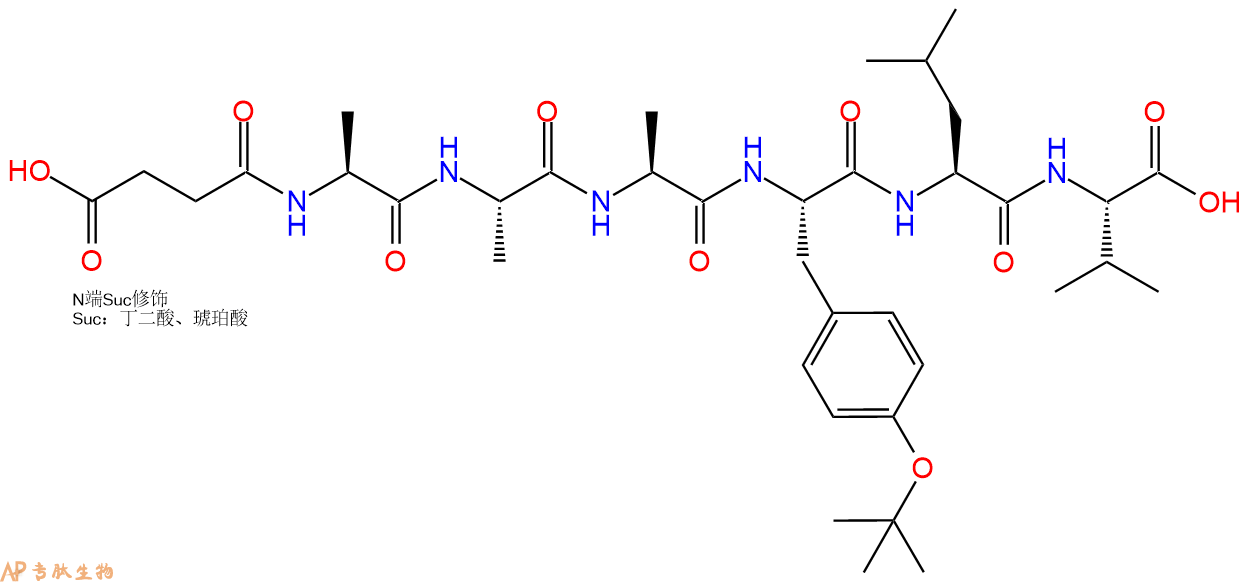 | 三字母: | Suc N端琥珀酰化,琥珀酰基是一种极性的N端修饰,对应于脱氨基天冬氨酸(deamino-Asp),常被掺入羧肽酶底物中。 -Ala丙氨酸:alanine。L-丙氨酸的系统命名为(2S)-氨基丙酸,是编码氨基酸,也叫L-α-丙氨酸。符号:A,Ala。D-丙氨酸存在于多种细菌细胞壁的糖肽中。β-丙氨酸是维生素泛酸和辅酶A的组分。 -Ala丙氨酸:alanine。L-丙氨酸的系统命名为(2S)-氨基丙酸,是编码氨基酸,也叫L-α-丙氨酸。符号:A,Ala。D-丙氨酸存在于多种细菌细胞壁的糖肽中。β-丙氨酸是维生素泛酸和辅酶A的组分。 -Ala丙氨酸:alanine。L-丙氨酸的系统命名为(2S)-氨基丙酸,是编码氨基酸,也叫L-α-丙氨酸。符号:A,Ala。D-丙氨酸存在于多种细菌细胞壁的糖肽中。β-丙氨酸是维生素泛酸和辅酶A的组分。 -TyrL-酪氨酸:tyrosine。系统命名为(2S)-氨基-3-(4-羟基苯基)丙酸。是编码氨基酸。符号:Y,Tyr。 -LeuL-亮氨酸:leucine。系统命名为(2S)-氨基-4-甲基戊酸。是编码氨基酸。是哺乳动物的必需氨基酸。符号:L,Leu。 -ValL-缬氨酸:valine。系统命名为(2S)-氨基-3-甲基丁酸。是编码氨基酸。是哺乳动物的必需氨基酸。符号:V,Val。在某些放线菌素如缬霉素中存在 D-缬氨酸。 -pNA对硝基苯胺 |
