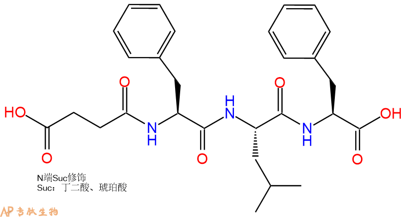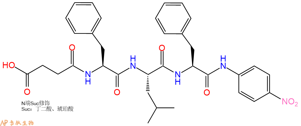 | 三字母: | Suc N端琥珀酰化,琥珀酰基是一种极性的N端修饰,对应于脱氨基天冬氨酸(deamino-Asp),常被掺入羧肽酶底物中。 -PheL-苯丙氨酸:phenylalanine。系统命名为(2S)-氨基-3-苯基丙酸。是编码氨基酸。是哺乳动物的必需氨基酸。符号:F,Phe。 -LeuL-亮氨酸:leucine。系统命名为(2S)-氨基-4-甲基戊酸。是编码氨基酸。是哺乳动物的必需氨基酸。符号:L,Leu。 -PheL-苯丙氨酸:phenylalanine。系统命名为(2S)-氨基-3-苯基丙酸。是编码氨基酸。是哺乳动物的必需氨基酸。符号:F,Phe。 -pNA对硝基苯胺 |