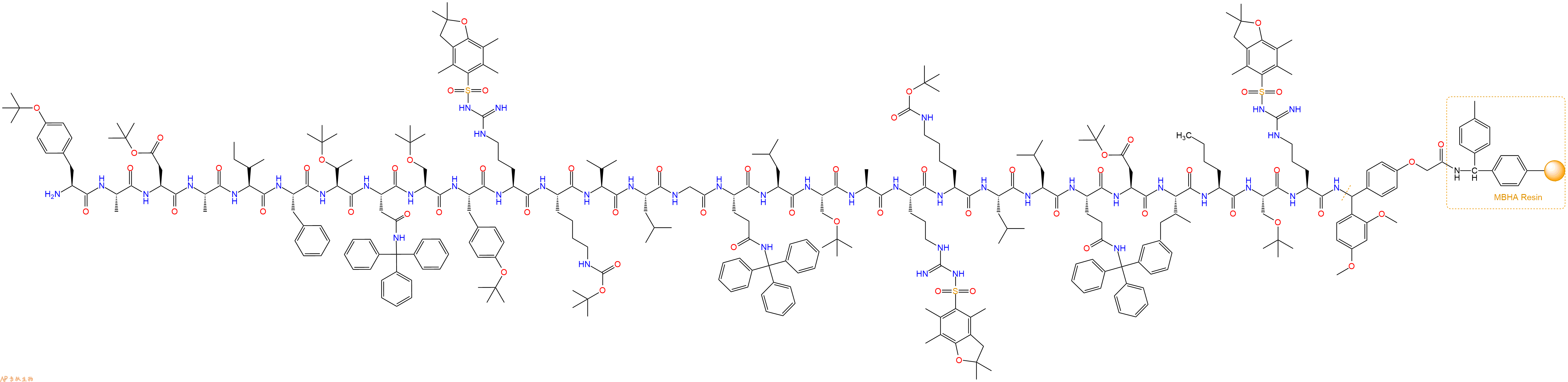 Fmoc-Ala-Ile-Phe-Thr(tBu)-Asn(Trt)-Ser(tBu)-Tyr(tBu)-Arg(Pbf)-Lys(Boc)-Val-Leu-Gly-Gln(Trt)-Leu-Ser(tBu)-Ala-Arg(Pbf)-Lys(Boc)-Leu-Leu-Gln(Trt)-Asp(OtBu)-Ile-Nle-Ser(tBu)-Arg(Pbf)-Linker-MBHA Resin
