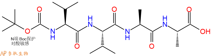 6、全保护切割:配置0.5%TFA/DCM溶液,溶液体积约为树脂体积的3倍。再次用DCM洗涤树脂2遍(去除残留DMF),后将配置好的溶液倒入到反应器中,反应30分钟。抽滤树脂,收集滤液(此时多肽已经从树脂上分离,存在于滤液中)。多肽序列为 Boc-Val-Val-Ala-Ala-CTC Resin。 在滤液中添加DIEPA,调PH至7-8。用饱和NaHCO3洗涤滤液,分离出DCM层溶液。可适当旋蒸DCM层溶液,减少有机溶剂。再次加入1或2倍体积的乙酸乙酯,用稀HCl溶液调PH至微酸性,将多肽从DCM层萃取到乙酸乙酯层。用饱和NaCl洗涤2次乙酸乙酯层。用无水硫酸镁吸收乙酸乙酯层的水分。通过减压旋蒸,直接将乙酸乙酯完全旋蒸掉,得到晶体状固体多肽,用于下一步C端反应。或通过减压旋蒸保留适量乙酸乙酯的溶液体积,加入冰乙醚析出 多肽,然后对多肽进行烘干操作即可用于下一步C端反应。Boc-Val-Val-Ala-Ala-COOH的结构图如下。