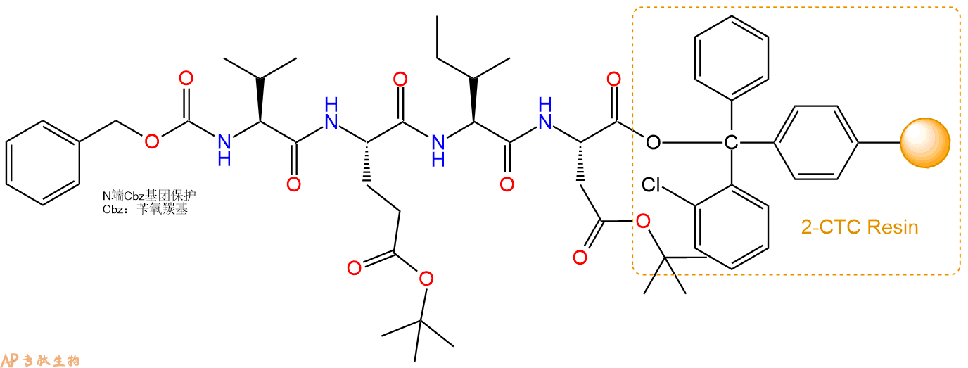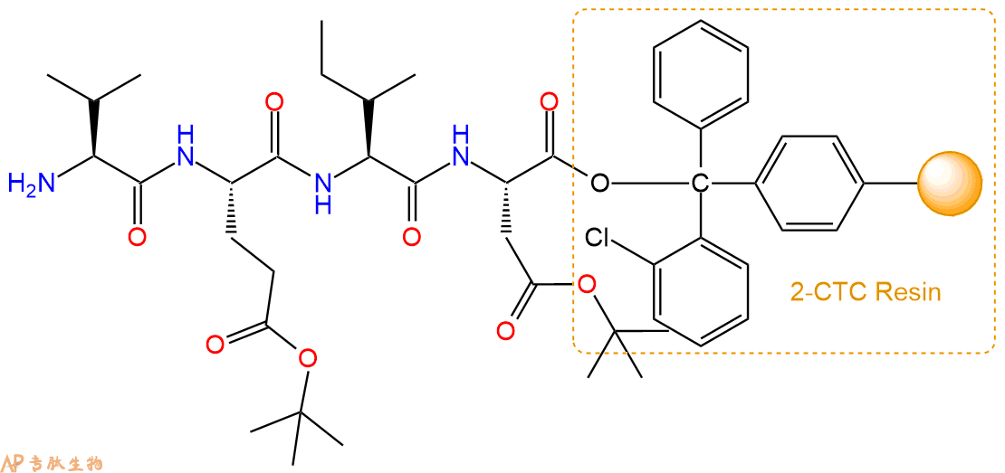 最后再经过步骤二得到 H2N-Val-Glu(OtBu)-Ile-Asp(OtBu)-CTC Resin,结构如下: