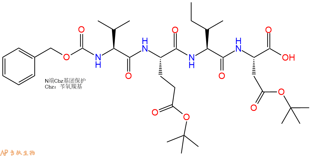 6、全保护切割:配置0.5%TFA/DCM溶液,溶液体积约为树脂体积的3倍。再次用DCM洗涤树脂2遍(去除残留DMF),后将配置好的溶液倒入到反应器中,反应30分钟。抽滤树脂,收集滤液(此时多肽已经从树脂上分离,存在于滤液中)。多肽序列为 Cbz-Val-Glu(OtBu)-Ile-Asp(OtBu)-CTC Resin。 在滤液中添加DIEPA,调PH至7-8。用饱和NaHCO3洗涤滤液,分离出DCM层溶液。可适当旋蒸DCM层溶液,减少有机溶剂。再次加入1或2倍体积的乙酸乙酯,用稀HCl溶液调PH至微酸性,将多肽从DCM层萃取到乙酸乙酯层。用饱和NaCl洗涤2次乙酸乙酯层。用无水硫酸镁吸收乙酸乙酯层的水分。通过减压旋蒸,直接将乙酸乙酯完全旋蒸掉,得到晶体状固体多肽,用于下一步C端反应。或通过减压旋蒸保留适量乙酸乙酯的溶液体积,加入冰乙醚析出 多肽,然后对多肽进行烘干操作即可用于下一步C端反应。Cbz-Val-Glu(OtBu)-Ile-Asp(OtBu)-COOH的结构图如下。