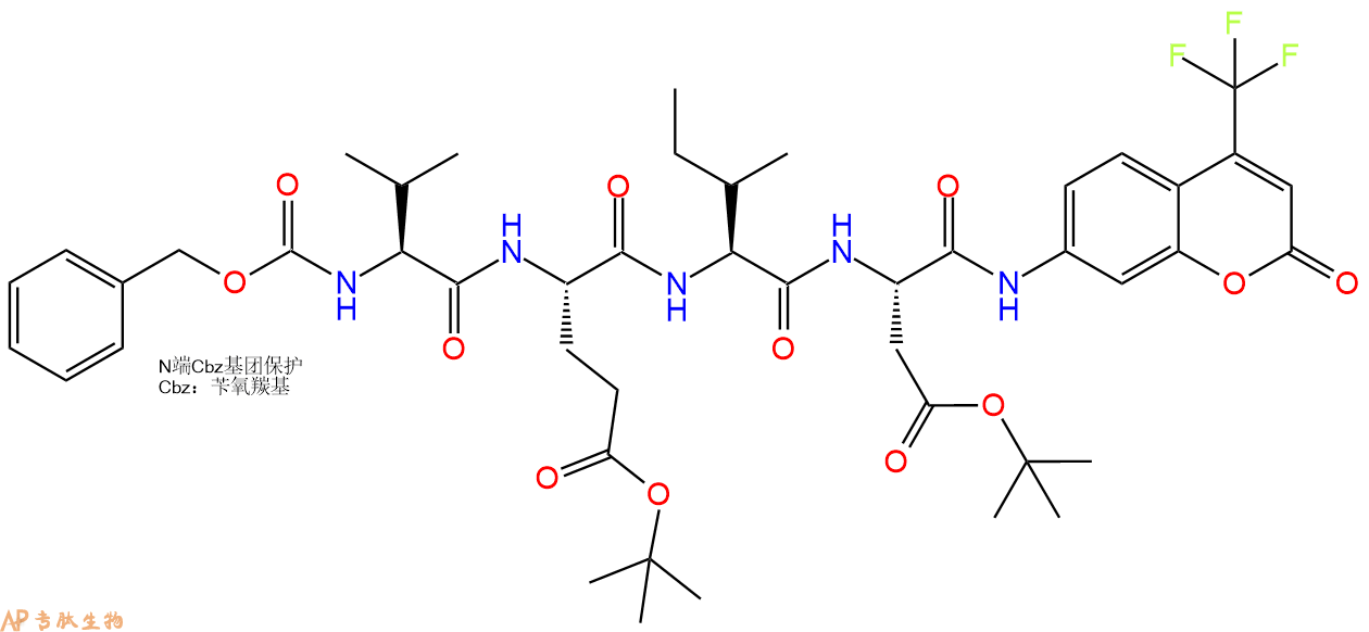 7、7-氨基-4-三氟甲基香豆素反应连接:在上述树脂中,加入适当DMF后,再加入1.04mmol 7-氨基-4-三氟甲基香豆素到树脂中,再加入2.08mmol DIPEA、0.99mmol HBTU,鼓氮气反应30分钟。用2倍树脂体积的DMF 洗涤3次树脂(洗涤树脂,去掉残留溶剂,为下一步反应做准备)。 得到 Cbz-Val-Glu(OtBu)-Ile-Asp(OtBu)-AFC。 结构如下: