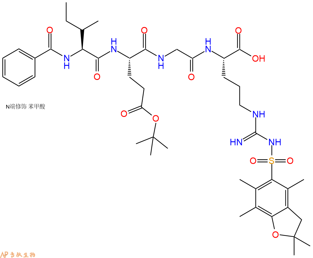 6、全保护切割:配置0.5%TFA/DCM溶液,溶液体积约为树脂体积的3倍。再次用DCM洗涤树脂2遍(去除残留DMF),后将配置好的溶液倒入到反应器中,反应30分钟。抽滤树脂,收集滤液(此时多肽已经从树脂上分离,存在于滤液中)。多肽序列为 Bzl-Ile-Glu(OtBu)-Gly-Arg(Pbf)-CTC Resin。 在滤液中添加DIEPA,调PH至7-8。用饱和NaHCO3洗涤滤液,分离出DCM层溶液。可适当旋蒸DCM层溶液,减少有机溶剂。再次加入1或2倍体积的乙酸乙酯,用稀HCl溶液调PH至微酸性,将多肽从DCM层萃取到乙酸乙酯层。用饱和NaCl洗涤2次乙酸乙酯层。用无水硫酸镁吸收乙酸乙酯层的水分。通过减压旋蒸,直接将乙酸乙酯完全旋蒸掉,得到晶体状固体多肽,用于下一步C端反应。或通过减压旋蒸保留适量乙酸乙酯的溶液体积,加入冰乙醚析出 多肽,然后对多肽进行烘干操作即可用于下一步C端反应。Bzl-Ile-Glu(OtBu)-Gly-Arg(Pbf)-COOH的结构图如下。