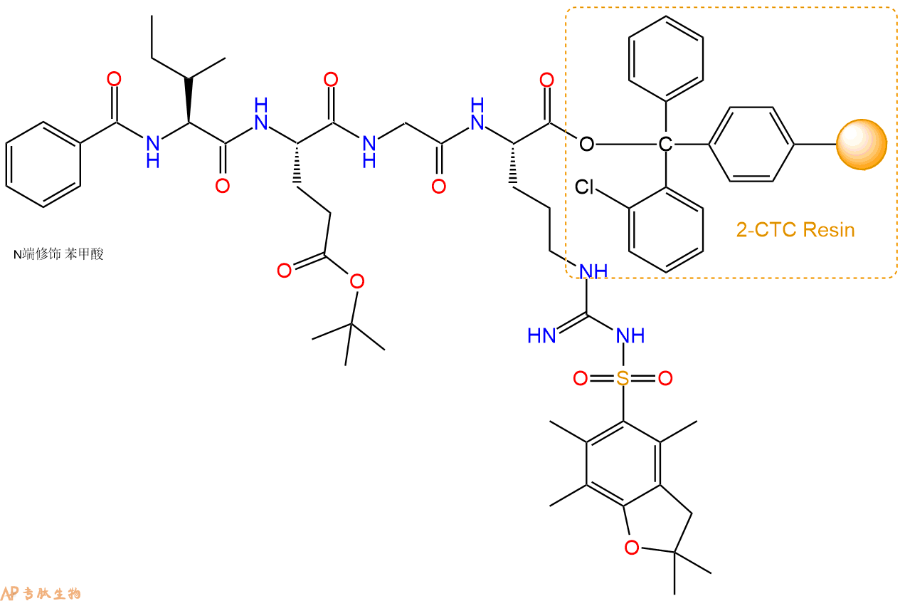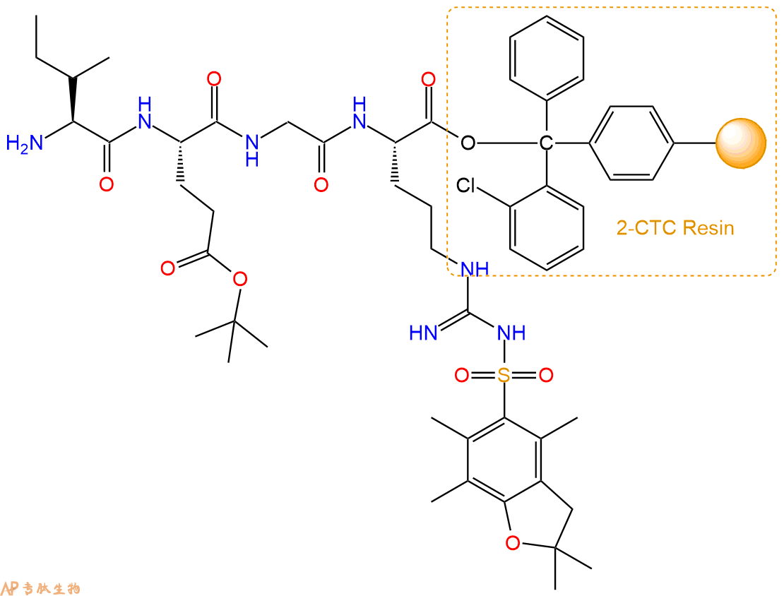 最后再经过步骤二得到 H2N-Ile-Glu(OtBu)-Gly-Arg(Pbf)-CTC Resin,结构如下: