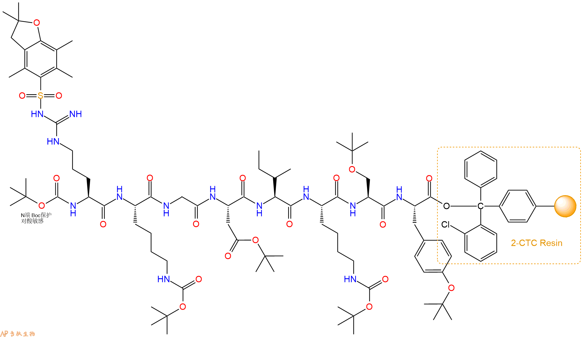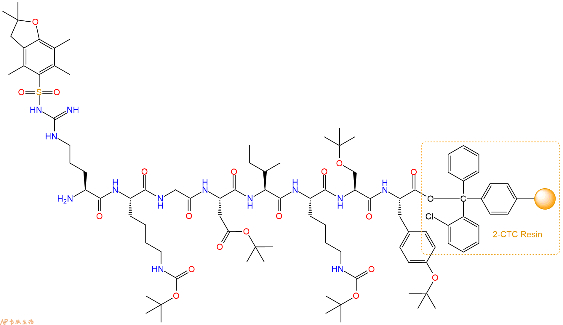 最后再经过步骤二得到 H2N-Arg(Pbf)-Lys(Boc)-Gly-Asp(OtBu)-Ile-Lys(Boc)-Ser(tBu)-Tyr(tBu)-CTC Resin,结构如下: