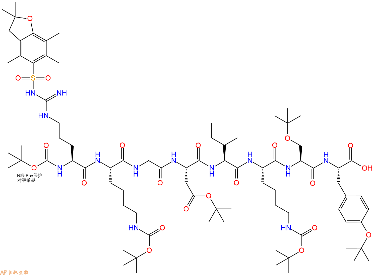 6、全保护切割:配置0.5%TFA/DCM溶液,溶液体积约为树脂体积的3倍。再次用DCM洗涤树脂2遍(去除残留DMF),后将配置好的溶液倒入到反应器中,反应30分钟。抽滤树脂,收集滤液(此时多肽已经从树脂上分离,存在于滤液中)。多肽序列为 Boc-Arg(Pbf)-Lys(Boc)-Gly-Asp(OtBu)-Ile-Lys(Boc)-Ser(tBu)-Tyr(tBu)-CTC Resin。 在滤液中添加DIEPA,调PH至7-8。用饱和NaHCO3洗涤滤液,分离出DCM层溶液。可适当旋蒸DCM层溶液,减少有机溶剂。再次加入1或2倍体积的乙酸乙酯,用稀HCl溶液调PH至微酸性,将多肽从DCM层萃取到乙酸乙酯层。用饱和NaCl洗涤2次乙酸乙酯层。用无水硫酸镁吸收乙酸乙酯层的水分。通过减压旋蒸,直接将乙酸乙酯完全旋蒸掉,得到晶体状固体多肽,用于下一步C端反应。或通过减压旋蒸保留适量乙酸乙酯的溶液体积,加入冰乙醚析出 多肽,然后对多肽进行烘干操作即可用于下一步C端反应。Boc-Arg(Pbf)-Lys(Boc)-Gly-Asp(OtBu)-Ile-Lys(Boc)-Ser(tBu)-Tyr(tBu)-COOH的结构图如下。