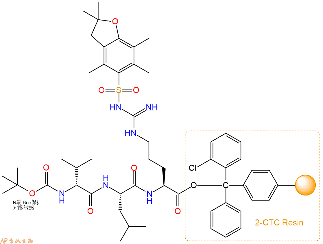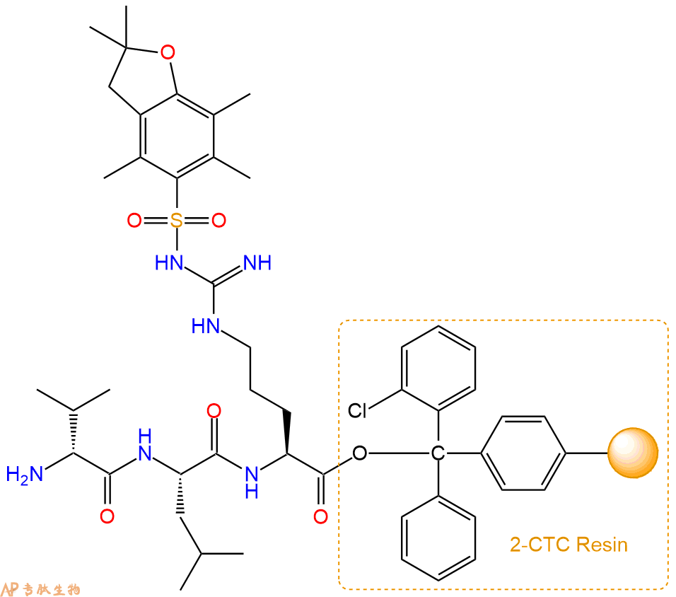 最后再经过步骤二得到 H2N-DVal-Leu-Arg(Pbf)-CTC Resin,结构如下: