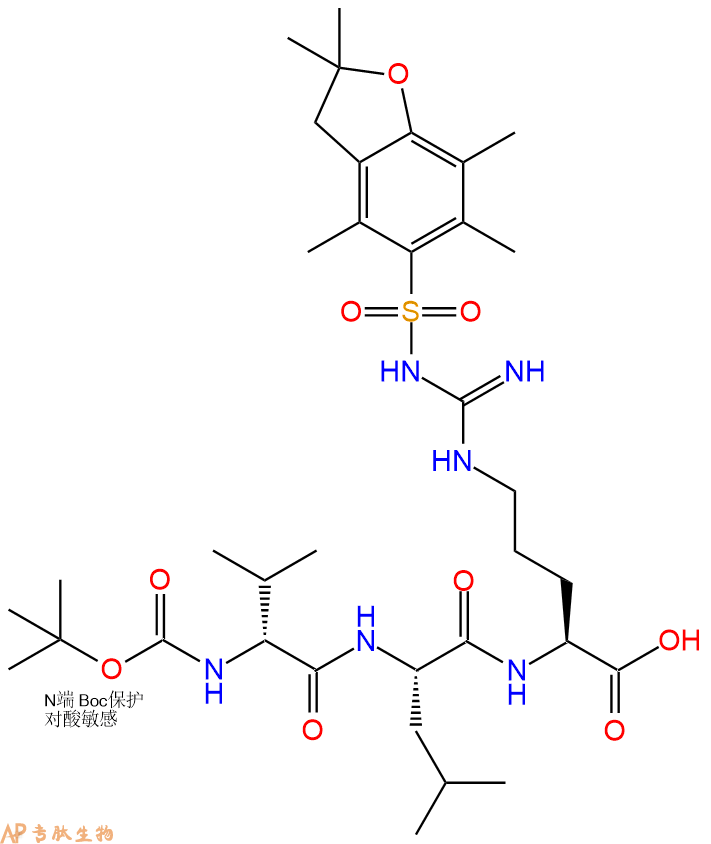 6、全保护切割:配置0.5%TFA/DCM溶液,溶液体积约为树脂体积的3倍。再次用DCM洗涤树脂2遍(去除残留DMF),后将配置好的溶液倒入到反应器中,反应30分钟。抽滤树脂,收集滤液(此时多肽已经从树脂上分离,存在于滤液中)。多肽序列为 Boc-DVal-Leu-Arg(Pbf)-CTC Resin。 在滤液中添加DIEPA,调PH至7-8。用饱和NaHCO3洗涤滤液,分离出DCM层溶液。可适当旋蒸DCM层溶液,减少有机溶剂。再次加入1或2倍体积的乙酸乙酯,用稀HCl溶液调PH至微酸性,将多肽从DCM层萃取到乙酸乙酯层。用饱和NaCl洗涤2次乙酸乙酯层。用无水硫酸镁吸收乙酸乙酯层的水分。通过减压旋蒸,直接将乙酸乙酯完全旋蒸掉,得到晶体状固体多肽,用于下一步C端反应。或通过减压旋蒸保留适量乙酸乙酯的溶液体积,加入冰乙醚析出 多肽,然后对多肽进行烘干操作即可用于下一步C端反应。Boc-DVal-Leu-Arg(Pbf)-COOH的结构图如下。