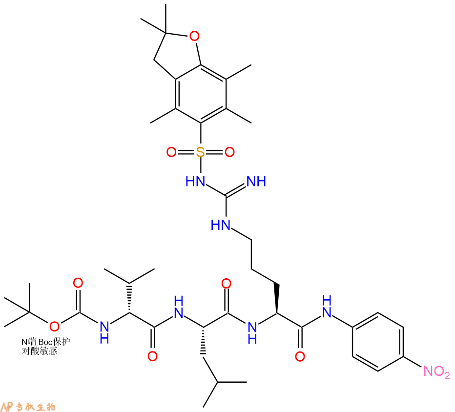 7、4-硝基苯胺反应连接:在上述树脂中,加入适当DMF后,再加入1.33mmol 4-硝基苯胺到树脂中,再加入2.65mmol DIPEA、1.26mmol HBTU,鼓氮气反应30分钟。用2倍树脂体积的DMF 洗涤3次树脂(洗涤树脂,去掉残留溶剂,为下一步反应做准备)。 得到 Boc-DVal-Leu-Arg(Pbf)-pNA。 结构如下: