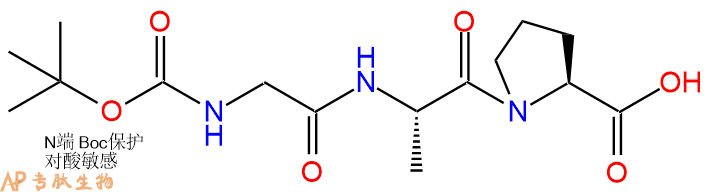6、全保护切割:配置0.5%TFA/DCM溶液,溶液体积约为树脂体积的3倍。再次用DCM洗涤树脂2遍(去除残留DMF),后将配置好的溶液倒入到反应器中,反应30分钟。抽滤树脂,收集滤液(此时多肽已经从树脂上分离,存在于滤液中)。多肽序列为 Boc-Gly-Ala-Pro-CTC Resin。 在滤液中添加DIEPA,调PH至7-8。用饱和NaHCO3洗涤滤液,分离出DCM层溶液。可适当旋蒸DCM层溶液,减少有机溶剂。再次加入1或2倍体积的乙酸乙酯,用稀HCl溶液调PH至微酸性,将多肽从DCM层萃取到乙酸乙酯层。用饱和NaCl洗涤2次乙酸乙酯层。用无水硫酸镁吸收乙酸乙酯层的水分。通过减压旋蒸,直接将乙酸乙酯完全旋蒸掉,得到晶体状固体多肽,用于下一步C端反应。或通过减压旋蒸保留适量乙酸乙酯的溶液体积,加入冰乙醚析出 多肽,然后对多肽进行烘干操作即可用于下一步C端反应。Boc-Gly-Ala-Pro-COOH的结构图如下。