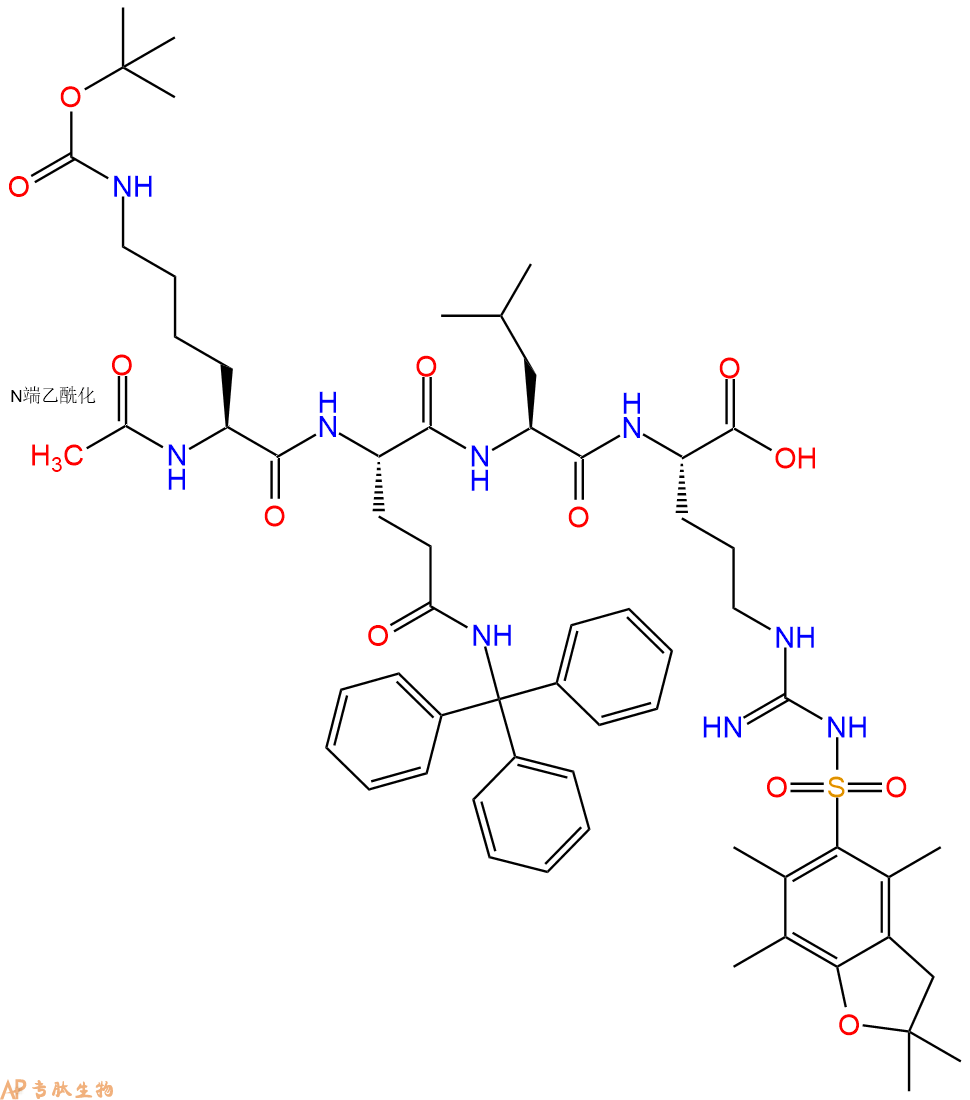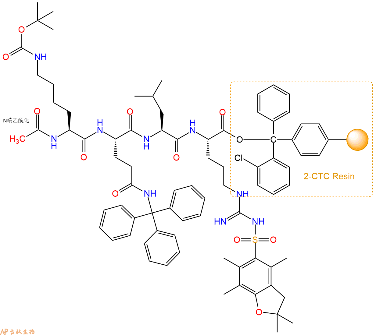 5、乙酸酐反应连接:在上述树脂中,加入适当DMF后,再加入2.38mmol 乙酸酐到树脂中,再加入4.75mmol DIPEA、2.26mmol HBTU,鼓氮气反应30分钟。用2倍树脂体积的DMF 洗涤3次树脂(洗涤树脂,去掉残留溶剂,为下一步反应做准备)。 得到Ac-Lys(Boc)-Gln(Trt)-Leu-Arg(Pbf)-CTC Resin。 结构如下:
