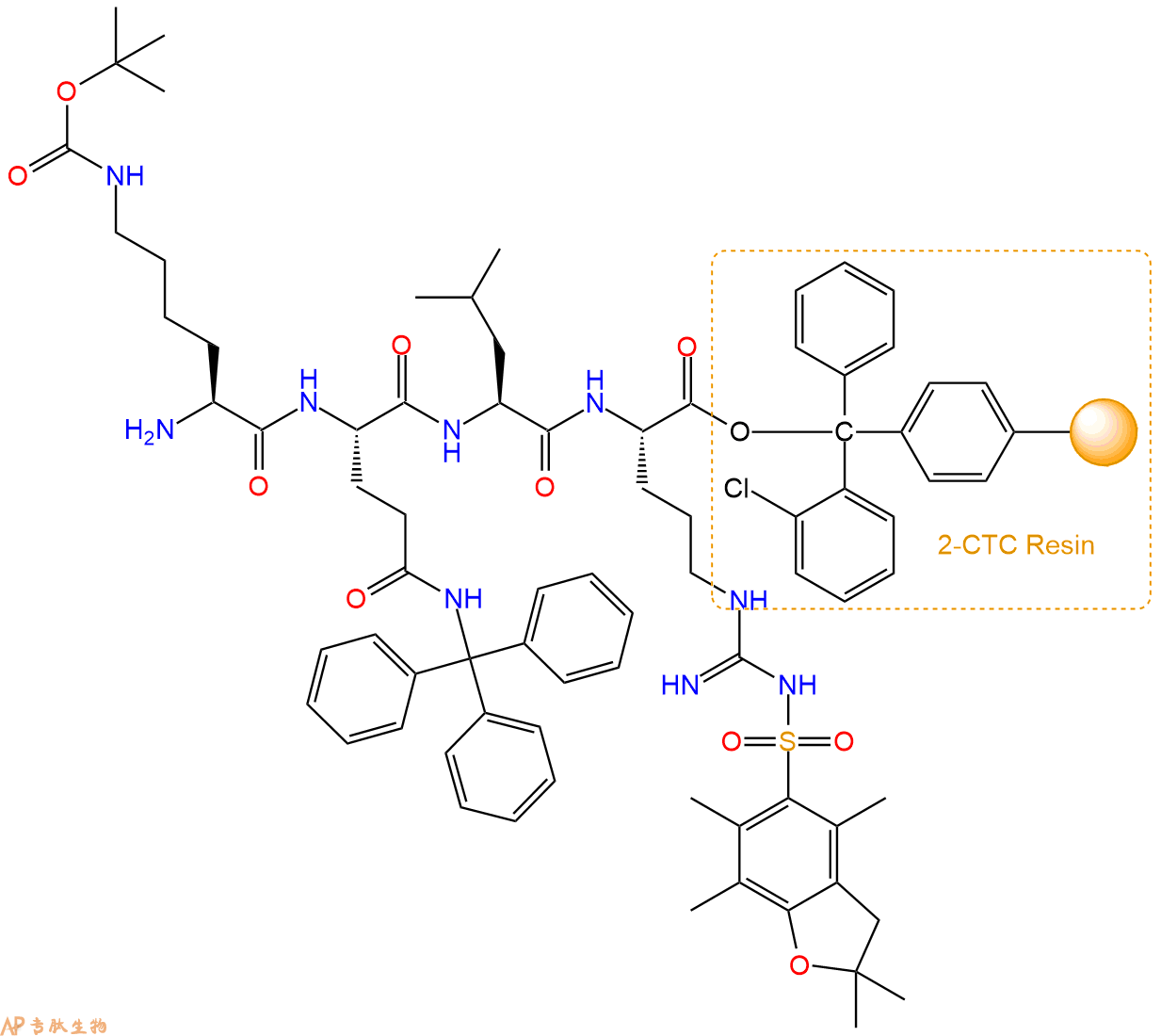 最后再经过步骤二得到 H2N-Lys(Boc)-Gln(Trt)-Leu-Arg(Pbf)-CTC Resin,结构如下: