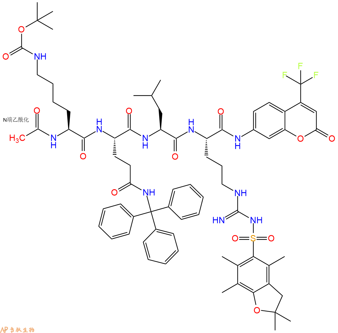7、7-氨基-4-三氟甲基香豆素反应连接:在上述树脂中,加入适当DMF后,再加入2.38mmol 7-氨基-4-三氟甲基香豆素到树脂中,再加入4.75mmol DIPEA、2.26mmol HBTU,鼓氮气反应30分钟。用2倍树脂体积的DMF 洗涤3次树脂(洗涤树脂,去掉残留溶剂,为下一步反应做准备)。 得到 Ac-Lys(Boc)-Gln(Trt)-Leu-Arg(Pbf)-AFC。 结构如下: