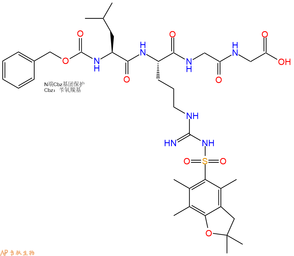 6、全保护切割:配置0.5%TFA/DCM溶液,溶液体积约为树脂体积的3倍。再次用DCM洗涤树脂2遍(去除残留DMF),后将配置好的溶液倒入到反应器中,反应30分钟。抽滤树脂,收集滤液(此时多肽已经从树脂上分离,存在于滤液中)。多肽序列为 Cbz-Leu-Arg(Pbf)-Gly-Gly-CTC Resin。 在滤液中添加DIEPA,调PH至7-8。用饱和NaHCO3洗涤滤液,分离出DCM层溶液。可适当旋蒸DCM层溶液,减少有机溶剂。再次加入1或2倍体积的乙酸乙酯,用稀HCl溶液调PH至微酸性,将多肽从DCM层萃取到乙酸乙酯层。用饱和NaCl洗涤2次乙酸乙酯层。用无水硫酸镁吸收乙酸乙酯层的水分。通过减压旋蒸,直接将乙酸乙酯完全旋蒸掉,得到晶体状固体多肽,用于下一步C端反应。或通过减压旋蒸保留适量乙酸乙酯的溶液体积,加入冰乙醚析出 多肽,然后对多肽进行烘干操作即可用于下一步C端反应。Cbz-Leu-Arg(Pbf)-Gly-Gly-COOH的结构图如下。
