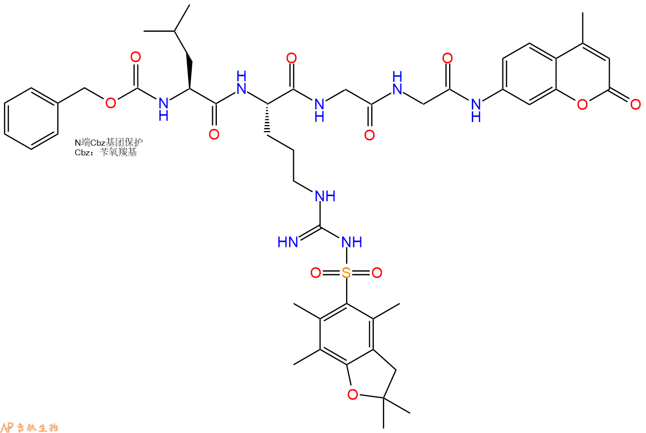 7、7-氨基-4-甲基香豆素反应连接:在上述树脂中,加入适当DMF后,再加入6.47mmol 7-氨基-4-甲基香豆素到树脂中,再加入12.94mmol DIPEA、6.14mmol HBTU,鼓氮气反应30分钟。用2倍树脂体积的DMF 洗涤3次树脂(洗涤树脂,去掉残留溶剂,为下一步反应做准备)。 得到 Cbz-Leu-Arg(Pbf)-Gly-Gly-AMC。 结构如下: