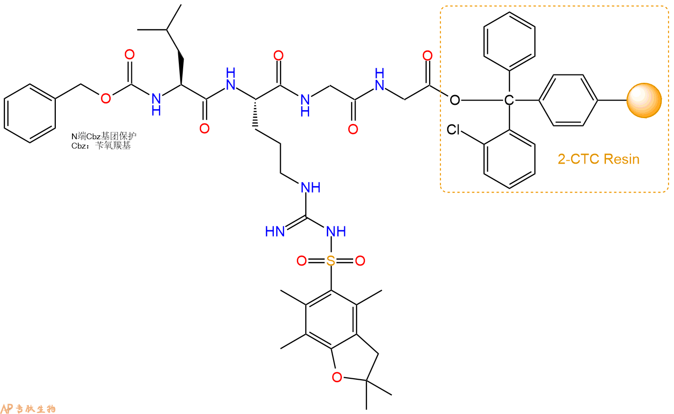 5、苯甲氧羰酰琥珀酰亚胺Cbz-Cl反应连接:在上述树脂中,加入适当DMF后,再加入6.47mmol 苯甲氧羰酰琥珀酰亚胺Cbz-Cl到树脂中,再加入12.94mmol DIPEA、6.14mmol HBTU,鼓氮气反应30分钟。用2倍树脂体积的DMF 洗涤3次树脂(洗涤树脂,去掉残留溶剂,为下一步反应做准备)。 得到Cbz-Leu-Arg(Pbf)-Gly-Gly-CTC Resin。 结构如下: