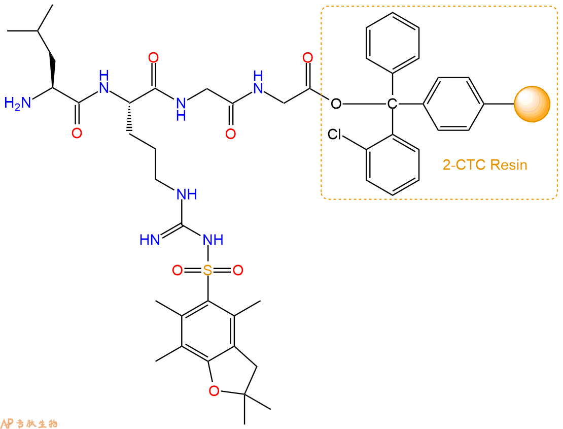 最后再经过步骤二得到 H2N-Leu-Arg(Pbf)-Gly-Gly-CTC Resin,结构如下: