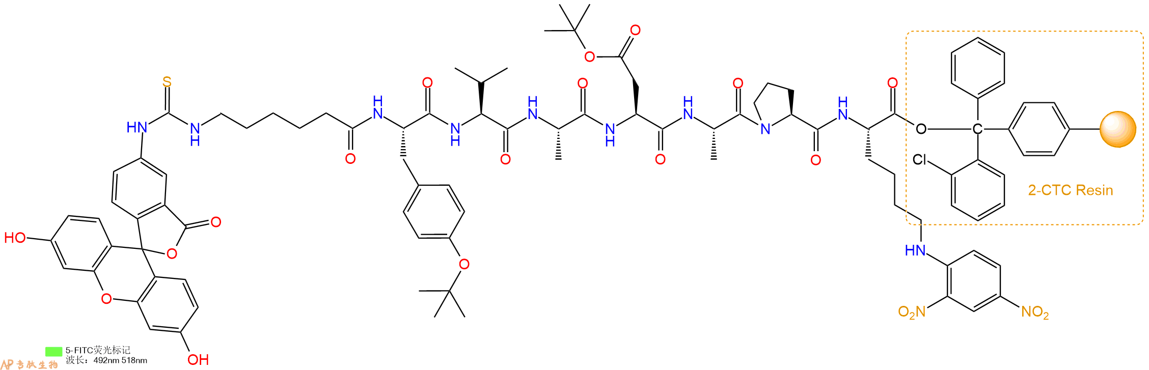 5、异硫氰酸荧光素酯 FITC反应连接:在上述树脂中,加入适当DMF后,再加入4.48mmol异硫氰酸荧光素酯 FITC到树脂中,再加入8.97mmol DIPEA,鼓氮气反应30分钟。用2倍树脂体积的DMF 洗涤3次树脂(洗涤树脂,去掉残留溶剂,为下一步反应做准备)。 得到5FITC-Ahx-Tyr(tBu)-Val-Ala-Asp(OtBu)-Ala-Pro-Lys(Dnp)-CTCResin。 结构如下: