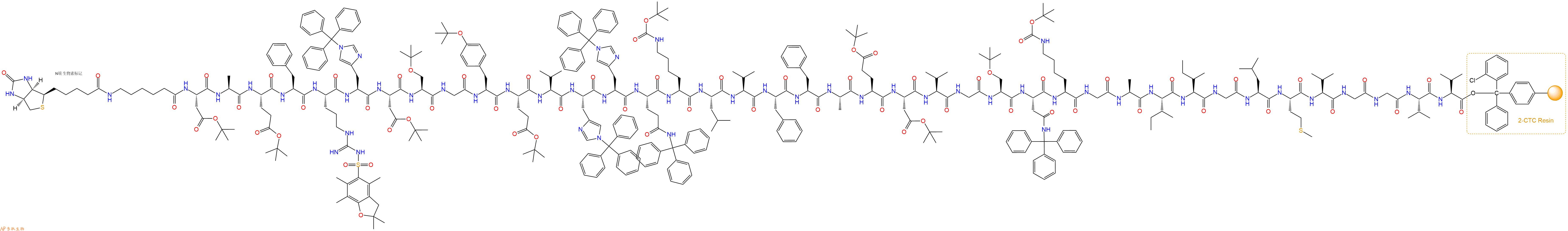 5、生物素反应连接:在上述树脂中,加入适当DMF后,再加入6.51mmol 生物素到树脂中,再加入13.03mmol DIPEA、6.19mmol HBTU,鼓氮气反应30分钟。用2倍树脂体积的DMF 洗涤3次树脂(洗涤树脂,去掉残留溶剂,为下一步反应做准备)。 得到Biotin-Ahx-Asp(OtBu)-Ala-Glu(OtBu)-Phe-Arg(Pbf)-His(Trt)-Asp(OtBu)-Ser(tBu)-Gly-Tyr(tBu)-Glu(OtBu)-Val-His(Trt)-His(Trt)-Gln(Trt)-Lys(Boc)-Leu-Val-Phe-Phe-Ala-Glu(OtBu)-Asp(OtBu)-Val-Gly-Ser(tBu)-Asn(Trt)-Lys(Boc)-Gly-Ala-Ile-Ile-Gly-Leu-Met-Val-Gly-Gly-Val-Val-CTCResin。 结构如下:
