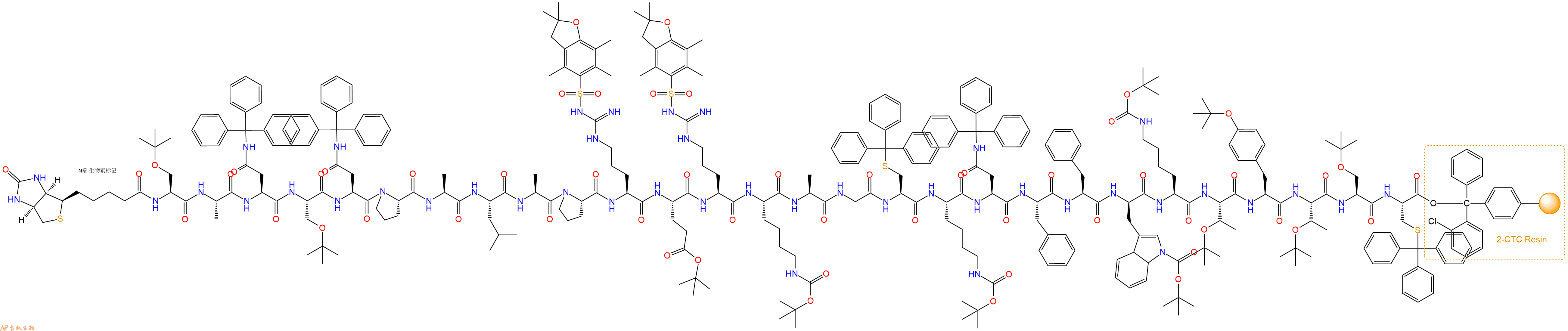 5、生物素反应连接:在上述树脂中,加入适当DMF后,再加入4.72mmol 生物素到树脂中,再加入9.44mmol DIPEA、4.49mmol HBTU,鼓氮气反应30分钟。用2倍树脂体积的DMF 洗涤3次树脂(洗涤树脂,去掉残留溶剂,为下一步反应做准备)。 得到Biotin-Ser(tBu)-Ala-Asn(Trt)-Ser(tBu)-Asn(Trt)-Pro-Ala-Leu-Ala-Pro-Arg(Pbf)-Glu(OtBu)-Arg(Pbf)-Lys(Boc)-Ala-Gly-Cys(Trt)-Lys(Boc)-Asn(Trt)-Phe-Phe-DTrp(Boc)-Lys(Boc)-Thr(tBu)-Tyr(tBu)-Thr(tBu)-Ser(tBu)-Cys(Trt)-CTCResin。 结构如下: